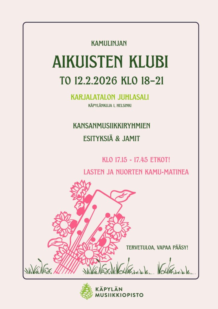 Käpylän musiikkiopiston kansanmusiikkilinjan aikuisharrastajien oma ilta. Ryhmien esityksiä, seurustelua ja lopuksi jamit! Tervetuloa mukaan musisoimaan tai vain nauttimaan esityksistä ja hengailemaan! Vapaa pääsy.