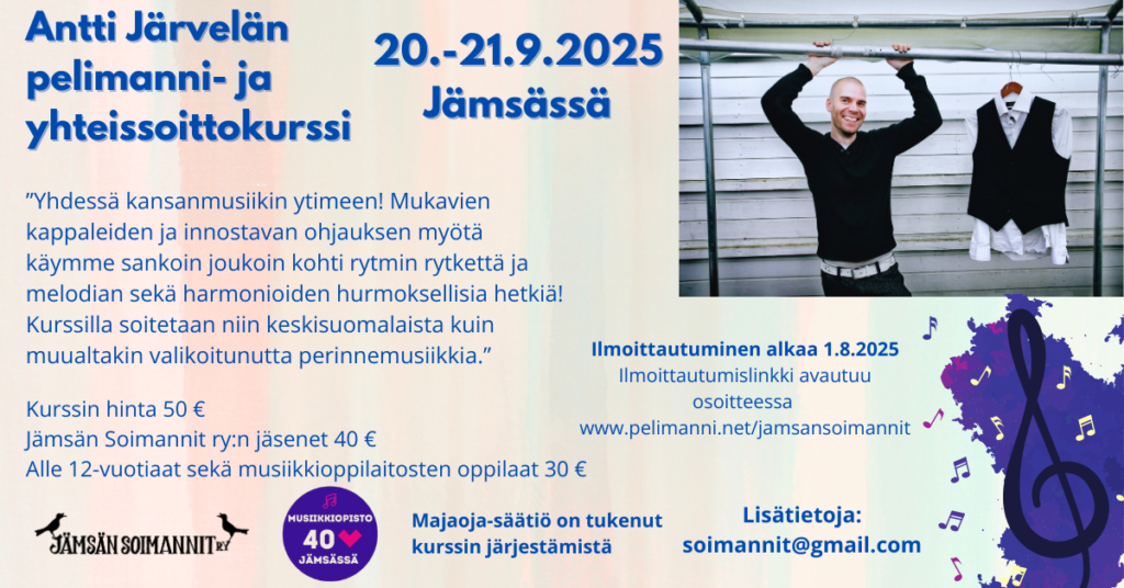 Luvassa mukavaa pelimannisvengiä ja soiton iloa "Anttimaiseen" tyyliin rennossa pelimannihengessä :) Lisää tietoa saat klikkaamalla kuvaa tai nettisivulta: https://pelimanni.net/jamsansoimannit/ *Ilmoittautumislinkki: https://forms.gle/hQiwgMPzJjrE5jXo8 Aikataulu Lauantaina 20.9. klo 9.30 ilmoittautuminen ja aamukahvi 10-16 opetusta (ruokailu, kahvitauko, tauot) Sunnuntai 21.9. klo 9.30 aamukahvi klo 10-13.30 opetusta (ruokailu ja tauot) klo 14-15 kurssin päätössoitto, yleisölle avoin (ilmainen) Kurssin hinta 50€ Jämsän Soimannit ry:n jäsenet 40€ Alle 12-vuotiaat sekä musiikkioppilaitosten oppilaat 30€ Kurssimaksu sis. materiaalin ja lauantain iltapäiväkahvin, sekä aamukahvit. Ilmoittautuneille lähetetään kurssitiedotteen ohessa nuottilinkki. Ruokailu paikan päällä Vitikkala-salissa -Varataan ilmoittautumisen yhteydessä. -Vaihtoehtoisesti omat eväät. Ruoan hinnat: la 20.9. aikuinen 15€, alle 12-vuotiaat 7,50€ su 21.9. aikuinen 17€, alle 12-vuotiaat 8,50€ Lisätietoja: soimannit@gmail.com Järjestää yhteistyössä Jämsän Soimannit ry ja Jämsänjokilaakson musiikkiopisto Majaoja-säätiö on tukenut kurssin järjestämistä