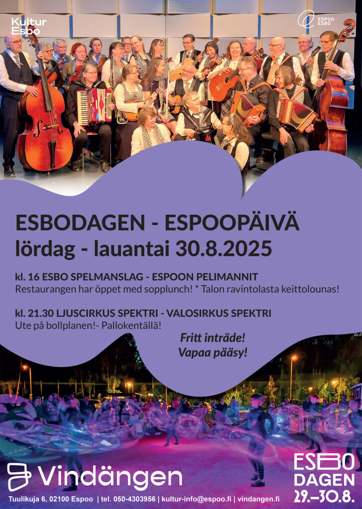 Esbo spelmanslag spelar glad spelmansmusik t.ex. från Esbo. Allsång på svenska och finska.
