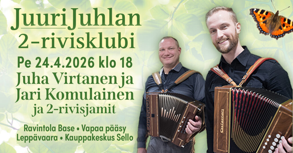 A fun 2-row accordion theme club! Two respected 2-row accordionists will organize the key rows and stretch the bellows in both necessary keys. At the JuuriJuhla club, you will hear both old familiar accordionist tunes and the players’ own compositions from this millennium and maybe something in between. Bring your 2-row accordion or other instrument and join the jams. 6-7 p.m. Juha Virtanen & Jari Komulainen Duo 7-8:30 p.m. Jams Base Restaurant, Sello Shopping Center, Leppävaarankatu 3, Espoo Welcome! Free admission