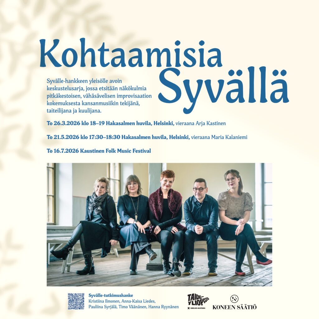 Kohtaamisia Syvällä on yleisölle avoin keskustelusarja, jossa etsitään näkökulmia pitkäkestoisen, vähäsävelisen improvisaation kokemuksesta kansanmusiikin tekijänä, taiteilijana ja kuulijana. To 26.3.2026 klo 18–19, vieraana Arja Kastinen, Tapahtumapaikkana Hakasalmen huvilan sali, Mannerheimintie 13 b, Helsinki. Arja Kastinen on Sibelius-Akatemian kansanmusiikin koulutusohjelman historian ensimmäinen tohtori. Tällä hetkellä hän toimii Taideyliopiston Sibelius-Akatemiassa vierailevana tutkijana. Hänen tutkimuksensa aiheena on runolaulukulttuurin suomalais-karjalainen kanteleimprovisaatio, sen erilaiset ilmenemismuodot alkuperäisessä kontekstissaan sekä sen mahdollisuudet ja ulottuvuudet tässä aikakaudessa. Aihe sisältää mm. soitin-, sävelmä-, kulttuuri- ja historiatutkimusta sekä improvisaation tutkimusta. Syvälle-tutkimushanke: Kristiina Ilmonen, Anna-Kaisa Liedes, Pauliina Syrjälä, Timo Väänänen, Hanna Ryynänen Tukijat: Koneen Säätiö, Taideyliopiston Sibelius-Akatemia