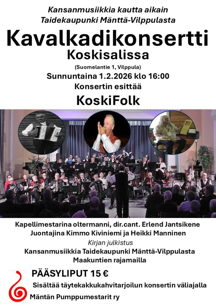 Kavalkadikonsertti, kapellimestarina oltermanni dir.cant. Erlend Jantsikene. Juontajina Kimmo Kiviniemi ja Heikki Manninen. Kirjan julkistus Kansanmusiikkia kautta aikain Taidekaupunki Mänttä-Vilppulasta - maakuntien rajamailla. Pääsyliput 15 €, sisältää täytekakkukahvitarjoilun konsertin väliajalla.