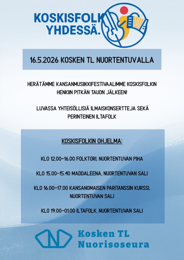 12 vuoden jälkeen KoskisFolk palaa – ja tuomme kansanmusiikin, tanssin ja yhdessäolon takaisin Nuortentuvan ympärille lauantaina 16.5.2026. Luvassa on yhteisöllisiä ilmaistapahtumia, koko perheen musiikkia, tanssia, torimeininkiä ja illalla perinteinen Iltafolk! ⏰ klo 12.00–16.00 – Folktori (ilmainen) Nuortentuvan pihalla soi ja liikkuu koko iltapäivä! ✨ Lähialueiden kansantanssiryhmät ✨ Pelimannit ✨ Torimyyjiä ✨ Kahvila ✨ Monipuolista ohjelmaa koko perheelle 🎈 klo 15.00–15.40 – Lastenkonsertti (maksuton) Paikkana Nuortentuvan sali. Lavalle nousee Maddaleena, joka tuo mukanaan: 🎵 tuttuja lastenlauluja 🤸 liikunnallisia laululeikkejä 🎭 ripauksen teatteria ✨ hämmästyttäviä taikatemppuja Tämä on mukaansatempaava esitys, jossa saa laulaa, nauraa ja pomppia – sopii kaikenikäisille! 💃 klo 16.00–17.00 – Kansanomaisen paritanssin kurssi (maksuton) Nuortentuvan salissa. Matala kynnys tutustua suomalaisiin paritansseihin kuten polkkaan, masurkkaan ja valssiin. Ei vaadi aiempaa kokemusta – yksin tai parin kanssa. Ohjaajana Jutta Wrangen. Painopiste: yhdessä tekemisen ilo! 🌙 klo 19.00–01.00 – Iltafolk (pääsymaksullinen, K18) Illan avaa tanssijamit, joissa jokainen pääsee mukaan kevyellä opastuksella. Sen jälkeen lavalle nousevat kansanmusiikin pitkän linjan kokoonpanot: 🎻 Retrot 🎶 Vissinki 🥁 Rymäkkä Tanssilattia pysyy avoinna ja tunnelma korkealla koko yön! Ennakkoliput huhtikuun loppuun asti 20 €, toukokuun ajan 25 € , ovelta 30 €. Lipputilaukset info@koskennuorisoseura.fi
