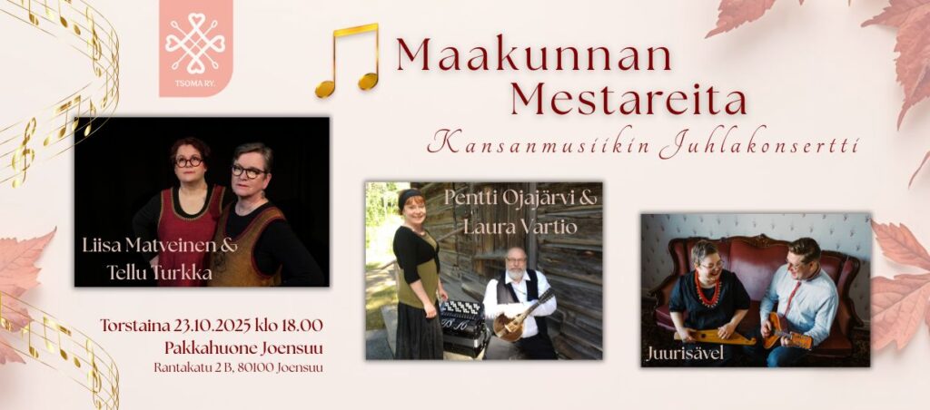 Maakunnan mestareita - Kansanmusiikin Juhlakonsertti to 23.10.2025 klo 18 Joensuun Pakkahuone Rantakatu 2 B, 80100 JOENSUU Ohjelma Ovet klo 17 Juurisävel klo 18 Mestaripelimanni (2021) Pentti Ojajärvi & Laura Vartio klo 18.30-19.15 Väliaika 20 min Mestarikansanlaulaja (2024) Liisa Matveinen & Tellu Turkka klo 19.35-20.20 Liput 25 € 20 € (Tsoma ry:n jäsenet) 10 € (opisk./tyött./eläk./lapset yli 7v) Alle 7v lapset ilmaiseksi Lippujen ennakkovaraukset sähköpostitse: tsomafolk@gmail.com Pakkahuoneen kahvio ja yhdistyksen tuotteiden myyntipiste Liisa Matveinen & Tellu Turkka Mestarikansanlaulaja Liisa Matveinen ja säveltäjä Tellu Turkka ovat pitkän linjan runonlaulajia. Ensimmäinen yhteinen julkaisu oli Tellu Turkan runolaulusatu Suden aika 1996. Duon ensimmäinen albumi Mateli julkaistiin vuonna 1999. Levyn sävellykset perustuvat ilomantsilaisen Mateli Kuivalattaren (1771–1846) runoihin. Yhteistyö jatkui niin ruotsalais-suomalaisessa Hedningarna -yhtyeessä kuin Suden aika -kvartetissa, jossa julkaistiin äänitteet Etsijä 2004 sekä Unta 2006. Vuonna 2011 julkaistiin duon toinen albumi Vienan naisia, joka sisältää vienalaisten naisrunonlaulajien tekstejä. Vuonna 2023 julkaistiin Iro Sissottaren runoihin sävelletty kokonaisuus IRO. Liisa ja Tellu paitsi säveltävät omaa musiikkia, myös sovittavat vanhoja runosävelmiä. Säestyssoittimina ovat kanteleet, ruotsalainen moraharppu sekä savesta tehty udu-rumpu. Pentti Ojajärvi & Laura Vartio "Kaustinen Folk Music Festival eli Kaustisen kansanmusiikkijuhlat myönsi 2021 mestaripelimannin arvonimen Pentti Ojajärvelle. Pentin soittimina ovat mandoliini ja kitara. Hän säveltää ja sovittaa kansanmusiikkia, sekä tekee ja esittää laulelmia. Yhteistyö haitaristi Laura Vartion kanssa on jatkunut toistakymmentä vuotta. Heidän ohjelmistossaan on sekä laulelmia että pelimannimusiikkia. " Mestaripelimanni Pentti Ojajärvi Kaustinen Folk Music Festival eli Kaustisen kansanmusiikkijuhlat myönsi 2021 mestaripelimannin arvonimen Pentti Ojajärvelle. Mestaripelimanni arvonimi myönnetään henkilölle, joka perinteisellä taidollaan, runsaalla ohjelmistollaan tai muilla merkittävillä ansioillaan on edistänyt kansanmusiikkiharrastusta. Pentin soittimina ovat mandoliini ja kitara. Hän säveltää ja sovittaa kansanmusiikkia, sekä tekee ja esittää laulelmia. Pentin soittoharrastus alkoi 1970-luvun puolivälissä Etelä-Pohjanmaalla. Aluksi soittimena oli kitara ja myös mandoliini on ollut mukana melkein alusta lähtien. Pentti soitti omassa kylässä toimineissa tanssiorkesterissa ja pelimanniyhtyeessä, jonka ohjelmistossa oli ajan hengen mukaisesti paljon kaustislaista pelimannimusiikkia sekä paikallisten Järviseudun viulupelimannien kappaleita. Mestaripelimanni Heikki Lahti esikuvana Kiinnostus kansanmusiikkiin kasvoi ja mandoliinista alkoi tulla tärkein soitin. Rääkkylän Kihauksen pelimannikursseilla Pentti kohtasi kurssiin opettajan toimineen Heikki Lahden, jonka kanssa yhteistyö jatkui Heikin kuolemaan saakka vuoteen 2019. Heikki Lahden merkitys mandoliinin soiton ja pelimannimusiinkin opettajana sekä ystävänä oli erittäin suuri. Oli etuoikeus ja kunnia päästä Heikin yhtyeeseen seuraamaan mestarin mandoliinin soittoa lähietäisyydeltä. Näitä esiintymisiä oli mm. kesäisin Kaustisella, jossa kokokohtia olivat Heikki Lahden kokoamien kaustislaisten viulupelimannien kanssa soitetut puskasoitot. 2000-luvulla heräsi halu opiskella lisää kansanmusiikkia. Karelia-ammattikorkeakoulussa suoritetun musiikkipedagogi (AMK) -tutkinnon opinnäytetyön aiheena oli ”Heikki Lahden pelimannimandolinismi”. Nykyisin Pentti soittaa useassa kokoonpanossa, mm. perheorkesterissa ja toimii savonlinnalaisen Puruveden pelimannien sekä kesäisin Kihauksen pelimannileirin vetäjänä. Yhteistyö haitaristi Laura Vartion kanssa on jatkunut toistakymmentä vuotta. Heidän ohjelmistossaan on sekä laulelmia että pelimannimusiikkia. Pelimannin mopo keulii -levy Vastajulkaistulla uudella levyllä kuullaan Pentin sävellyksiä ja sovituksia Pentin mandoliinin ja perheorkesterin voimin esitettynä. Levyn ytimessä ovat yhdessä tekemisen riemu ja perinteen siirtäminen elävänä ja uudistuvana musiikkina sukupolvelta toiselle. Juurisävel Joensuulainen Juurisävel-duo, jonka muodostavat muusikot Kirsi Uutinen ja Jari Lappalainen, on keskittynyt elvyttämään ja uudistamaan perinteistä pohjoiskarjalaista kansanlauluperinnettä. Molemmilla muusikoilla on vahvat juuret kansanmusiikissa, ja he ammentavat inspiraatiota maakunnan historiasta ja kulttuurista. Kirsi ja Jari ovat monipuolisia ammattilaisia, joiden taustat ulottuvat myös eri musiikkityyleihin ja soittimiin. Uutinen on tunnettu kansanlaulajana, joka uskaltaa ja osaa yhdistää perinteisen äänenkäytön nykykansanmusiikin tulkintoihin. Lappalainen puolestaan tuo mukanaan laajan osaamisen erilaisista akustisista kansansoittimista, jotka rikastuttavat duon ilmaisua. Duo esittää ohjelmistossaan Kiihtelysvaaran alueelta vuosien 1899–1950 välisenä aikana kerätyistä kansanlauluista tehtyjä omia sovituksia. Kansanlauluista koottiin vuonna 1978 Karjalaisen kulttuurin edistämissäätiön julkaisema laulukirja “Karjalaisia kansanlauluja Kiihtelysvaarasta”. Näitä Kyllikki Maliston keräämiä lauluja Juurisävel on sovittanut nykyaikaan. Sovituksissa kuuluu laajalti vaikutteita monista eri musiikkikulttuureista: skandinaavinen ja suomalais-ugrilainen kansanmusiikki, länsiafrikkalainen rytmiikka, amerikkalaisperäinen juurimusiikki ja akustisten etnisten soittimien soundit kohtaavat kiinnostavalla tavalla Juurisävelen musiikissa. Duon debyyttialbumi "Kiihtelyksen laulut" julkaistiin marraskuussa 2024.