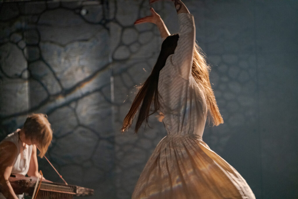 In 19th-century Border Karelia, the term “playing one’s own might” was used among kantele players. This expression referred to long, introspective improvisations that allowed musicians to express their emotions and inner states. Similarly, in the 1950s, Authentic Movement emerged in Western contemporary dance practice—an approach born at the intersection of expressive dance and Jungian psychology. This method invites movers to close their eyes and surrender to the impulses of their subconscious. Syntyä / syvyydestä is a collaboration between two performers who express themselves through dance and music, along with a scenographer. Staying true to its sources of inspiration, the work taps into hidden, subconscious landscapes—the unseen spaces behind closed eyelids—summoned into being by dance and music. This sensory field journey resonates through strings, bows, hair, knees, tails, fingers, and spines. CREDITS Outi Markkula – movement, cello, vocal, dramaturgy Emilia Lajunen – movement, 5-stringed fiddle, contrabasharpa, vocals, dramaturgy Jaana Kurttila – overhead projector, scenography, dramaturgy Technical implementation of lights in the original version: Anssi Pöyhönen/ITAK Production: Regional Dance Centre of Eastern Finland, Outi Markkula Supporters: Finnish Cultural Foundation / North Savo Regional Fund, Kone Foundation, Arts Promotion Centre Finland Performance Photos: Petra Kuha