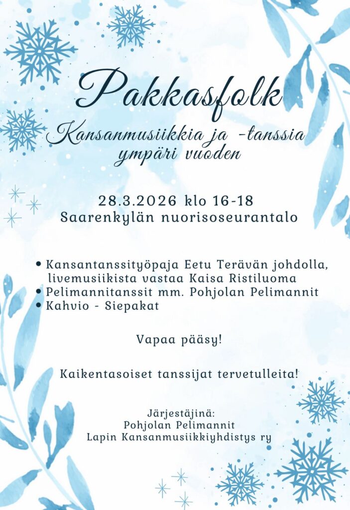 Pakkasfolk – Folk Music and Dance Pakkasfolk is a new folk music and dance gathering in Rovaniemi. The afternoon begins with a folk dance workshop with live music, followed by folk dance tunes played by Pohjolan Pelimannit. Free entry – everyone is welcome and no previous dance experience is needed. Café by Siepakat.