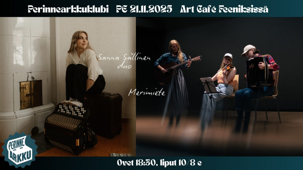 18.30 ovet 19.00 Merimiete 20.00 Sanna Sällinen duo Liput 10/8 e (opiskelijat ja työttömät) ovelta tai Perinnearkun Holvi-nettikaupasta. Lisäksi Holvista on ostettavissa 3 kpl “Maksa mitä pystyt” -lippuja. *** Merimiete Uuden kamupop-trion Merimietteen musiikissa kuuluu meren pauhu, aaltojen liplatus, kansanmusiikkiperinne, sekä improvisaatio. Merimietteen ohjelmistoon kuuluu kansanlauluja uudelleen sovitettuna, kokonaan uusia sävellyksiä sekä näiden fuusioita. Laulujen teemat vievät muun muassa yhteisöstä lähtemisen, Jäämeren rannalla vietetyn unettoman yön ja traagisen rakkauden äärelle. Sävellykset ovat saaneet vaikutteita esimerkiksi popista, countrysta, jazzista ja pohjoismaisesta kansanmusiikista. Kappaleiden sanoituksissa nivoutuu yhteen pop-estetiikka ja kansanlauluperinne. Emmi Rajala - laulu, kitara, huilu, sävellykset Tuike Suomalainen - viulu, laulu Verna Kylmänen - harmonikka ja piano *** Sanna Sällinen duo Jyväskyläläinen haitaristi-laulaja-säveltäjä Sanna Sällinen ja helsinkiläinen kitaristi Aapo Nieminen luovat duona uniikin nykykansanmusiikin äänimaiseman esittäessään kappaleita Sällisen toukokuussa 2025 ilmestyneeltä Sellaiset asiat -debyyttialbumilta. Sällisen kansanmusiikkiin pohjaavassa, genrerajoja ylittävässä musiikissa loitsut, runolaulut ja pelimannimusiikin poljennot kohtaavat kerroksellisen sävelkielen, jota sävyttävät hersyvät melodiat sekä maailmaa ja ihmisyyttä ihmettelevät tekstit. Yhteen kietoutuneet harmonikka ja laulu täydentyvät Niemisen sähkökitaran käsittelyllä, joka luo harmonikan sävyjen ympärille valloittavia ja kiinnostavia maailmoja! Luvassa on sekä vaikuttavaa intiimiä tunnelmointia että riemukasta menoa – tervetuloa kokemaan! Sanna Sällinen - harmonikka, laulu, sävellykset Aapo Nieminen - sähkökitara